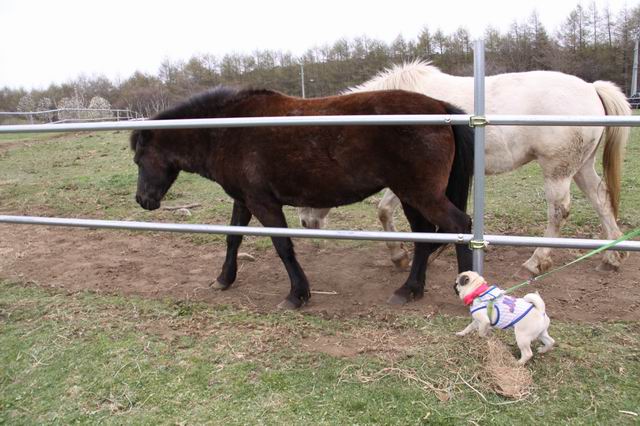 歩いてるお馬さんを追っ掛ける兄妹っ
