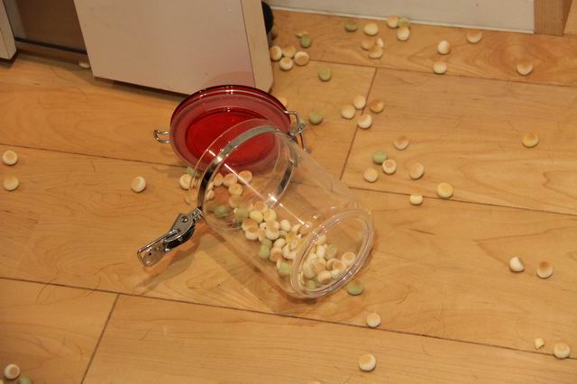 ぶつかって、ボーロの入れ物落としてしまいました
