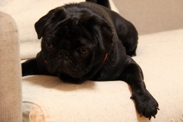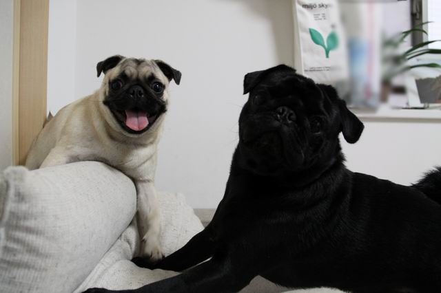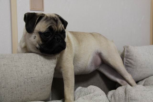 もしかして、パグってソファーの背もたれの上が好き???